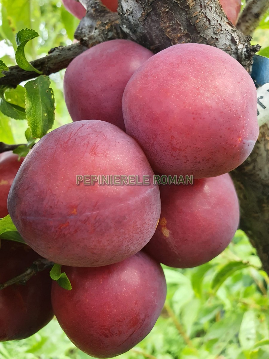 Descriere: Pom de vigoare medie, coroana medie larga, intrare precoce in productie, incepand cu anul 3 de cultura. Soiul este androsteril si necesita polenizatori, rezistent la seceta. Fructul este mare, peste 80 grame, culoarea epidermei fiind rosu intens, acoperita cu pruina abundenta. Pulpa este galbena, consistenta, cu un gust placut, neaderenta la sambure.