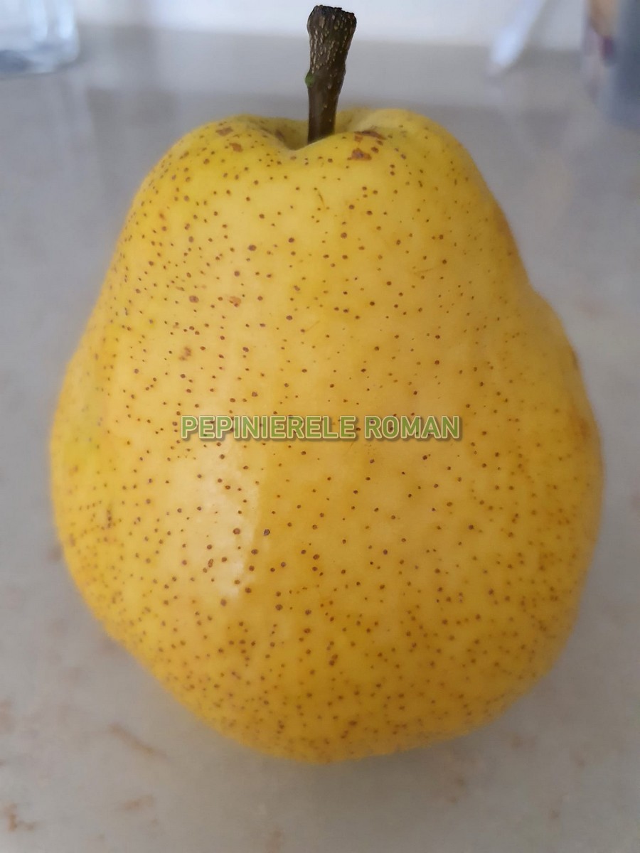 - Mărime și Formă: Fructul este mare sau foarte mare (250 – 550 g), de formă caracteristică ovoidală sau bi-conică (bombat la mijloc și îngustat la ambele capete).