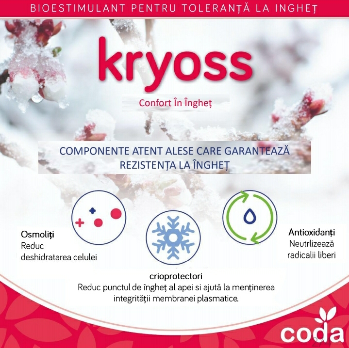 kryoss este o solutie lichida de potasiu cu un continut specific de aminoacizi si alti compusi osmoprotectori (169.5 g/l) care confera toleranta la stress si previne daunele cauzate de inghet. kryoss reduce efectul ingheturilor tarzii si creste starea de supravietuire a florilor plantelor lemnoase, diminuand riscul de pierdere a productiei si a calitatii fructelor. Potentialul osmoregulator a compusilor lui kryoss, face posibila reducerea punctului de inghet, prevenind formarea intracelulara a crystalelor de gheata, pierderea integritatii membranei si moartea celulei.