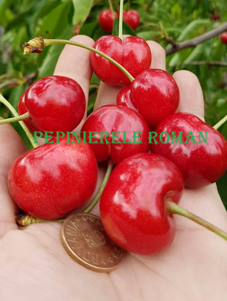 Descriere: Pomul este de vigoare mijlocie – mare, foarte productiv, precoce, constant, dar autosteril, necesita polenizatori: Silvia, Karina, Summit, Van, Stella. Fructul este foarte mare (10 – 12 g), rotund, usor aplatizat, rosu aprins, foarte atractiv. Pulpa este dulce, ferma, suculenta, gust bine echilibrat, neaderenta la sambure. Soi rezistent la craparea fructelor.