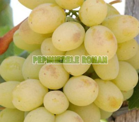 Descriere: Butucul are vigoare medie spre mare. Strugurii sunt mari, de forma cilindro-conici, aripati, cu boabele asezate compact pe ciorchine. Boabele sunt foarte mari, oval-alungite de culoare galben-aurii. Pielita subtire, de culoare alb – galbui, acoperita cu un strat gros de pruina. Pulpa este densa, carnoasa, cu gust armonios placut, contine 2-3 seminte. Are perioada de vegetatie scurta, maturarea strugurilor incepe la sfarsitul lunii august. Rezistenta la ger este mijlocie (pana la -22ºC.), si este sensibil la boli.